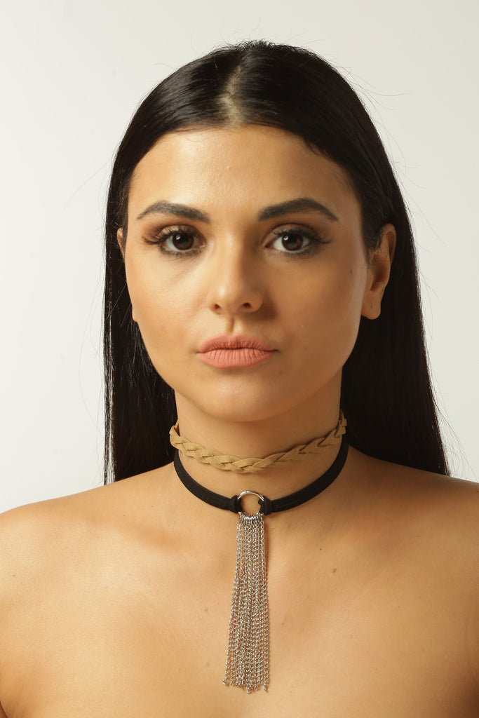 Be in touch with your Free Spirit…Literally. This fun double stacked look includes a beige braided choker along with a silver fringe choker to spice up the duo.